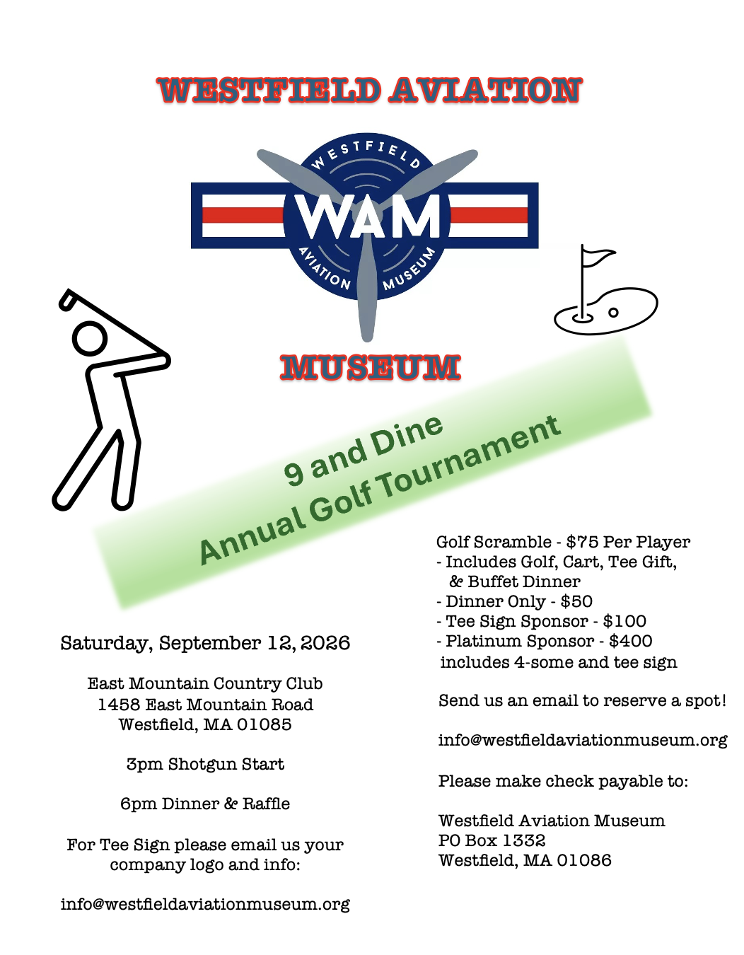 Sept 12th: Our Annual 9 and Dine Golf Tournament and Dinner at Westfield’s own East Mountain CC.